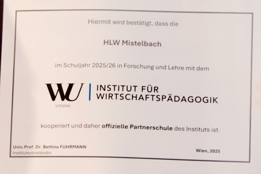 Seit dem Schuljahr 2025/26 sind HLW und FW Mistelbach offizielle Partnerschulen der Wirtschaftsuniversität Wien.