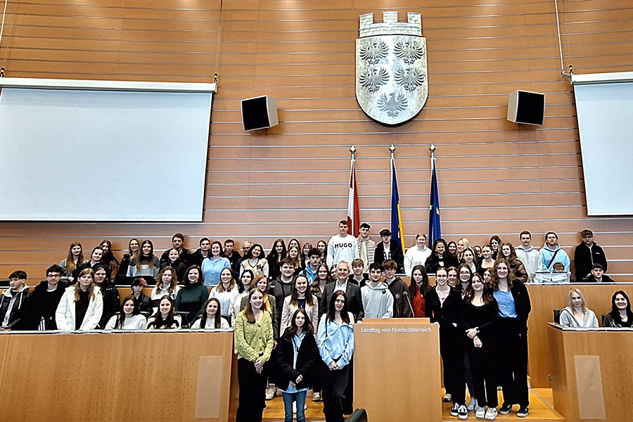 Die SchülerInnen durften im Landtagssaal dort Platz nehmen, wo sonst nur die Abgeordneten den politischen Debatten folgen. Herzlich begrüßt wurden sie hier von Herrn Landtagspräsidenten Mag. Karl Wilfing, der sich Zeit nahm, um den SchülerInnen wesentliche Abläufe im Landtag zu erklären. Die Jugendlichen erhielten dabei auch einen authentischen Einblick in das Leben eines Politikers. Anschließend wurden die SchülerInnen zu einem ausgiebigen Buffet eingeladen, eine willkommene Stärkung, die bei allen großen Anklang fand.
