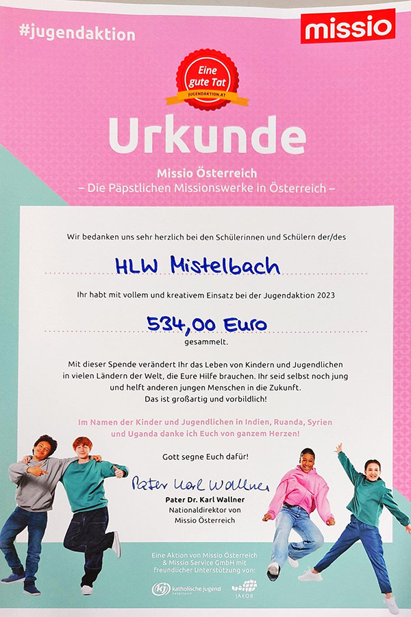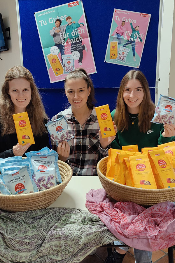 Durch den Verkauf von fair gehandelten Schokopralinen und Chips konnten wir (die fünften Klassen der HLW) im Rahmen der Jugendaktion von missio durch eure tolle Unterstützung 534 Euro Spenden für Kinder und Jugendliche in Indien, Ruanda, Syrien und Uganda einsammeln.