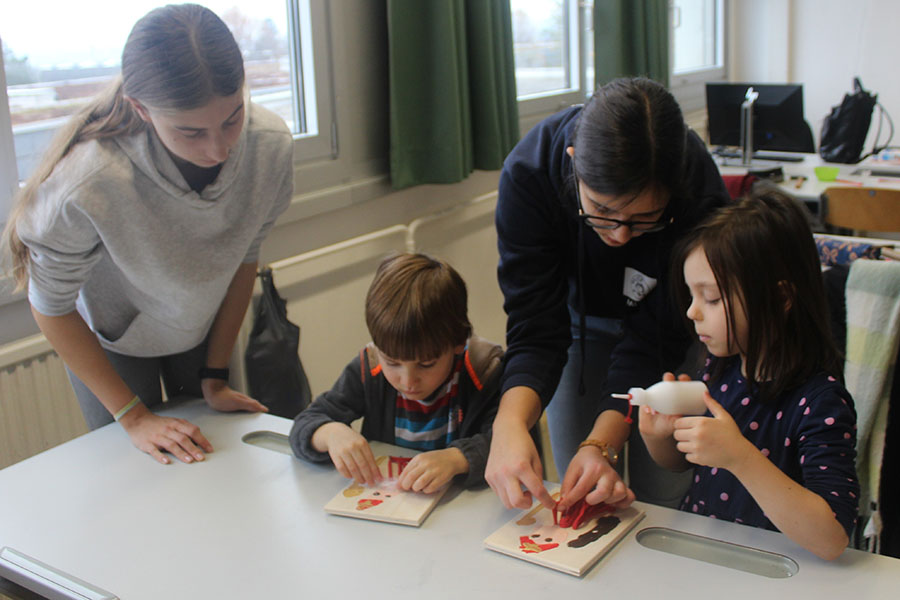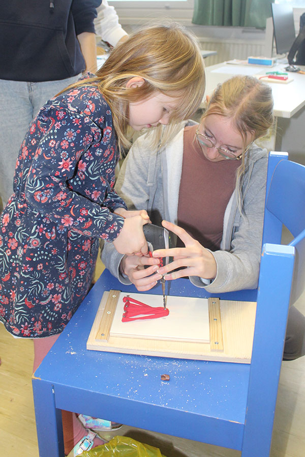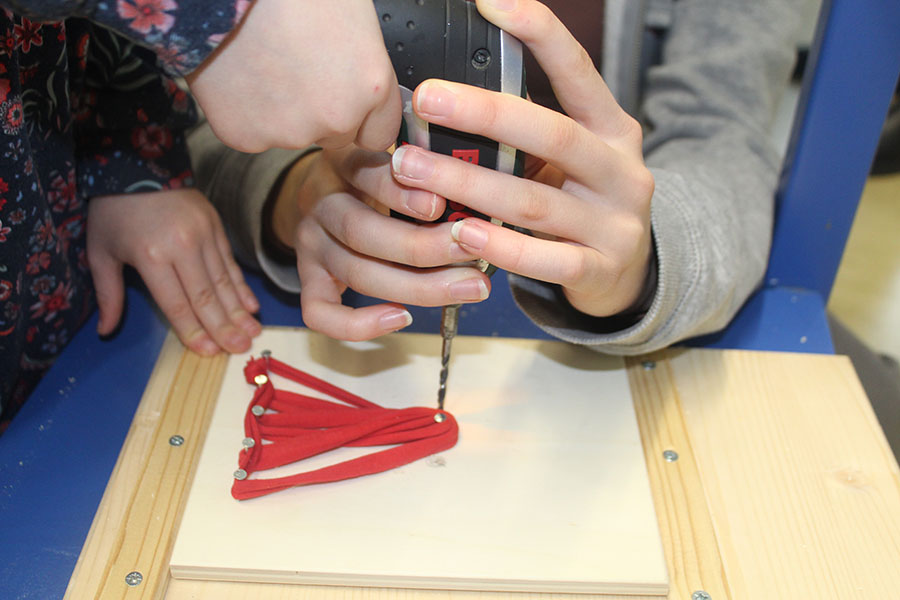 Eine Holzplatte, ein paar Nägel, eine Bohrmaschine und schon kann es losgehen: Die Kinder probierten sich beim Werken aus und hatten das Erfolgserlebnis, etwas mit den eigenen Händen entstehen zu lassen. Konzentriert schlugen sie die Nägel in die Holzplatte ein. Mit der Bohrmaschine schulten sie die Auge-Hand-Koordination. Sie lernten, Druck richtig zu dosieren, um ein passendes Bohrloch anzufertigen. Mit etwas zu arbeiten, was auch gefährlich sein kann, richtig und achtsam zu hantieren, stärkt das Selbstbewusstsein und die Verantwortung für das eigene Handeln.